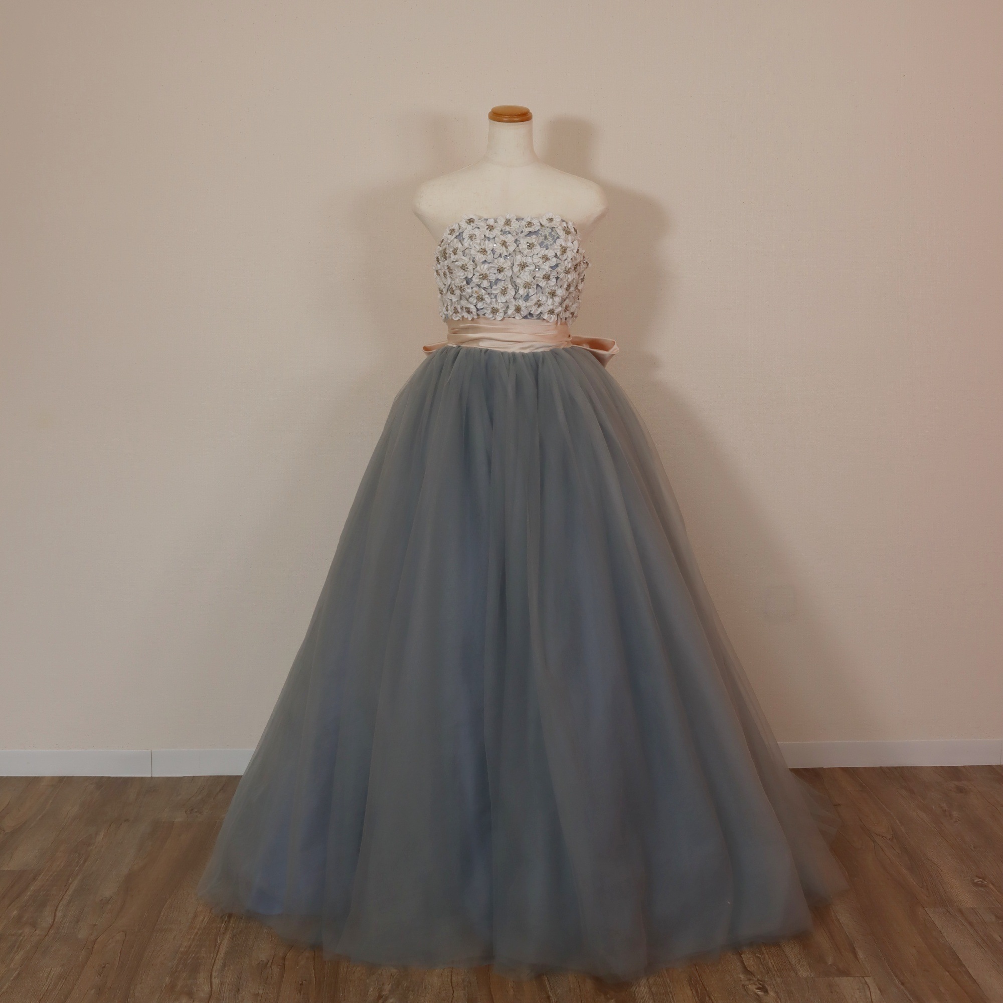 上品!シャンパン色 カラードレス キラキラチュール ベアトップ ラッフルフリル 編み上げ 前撮り